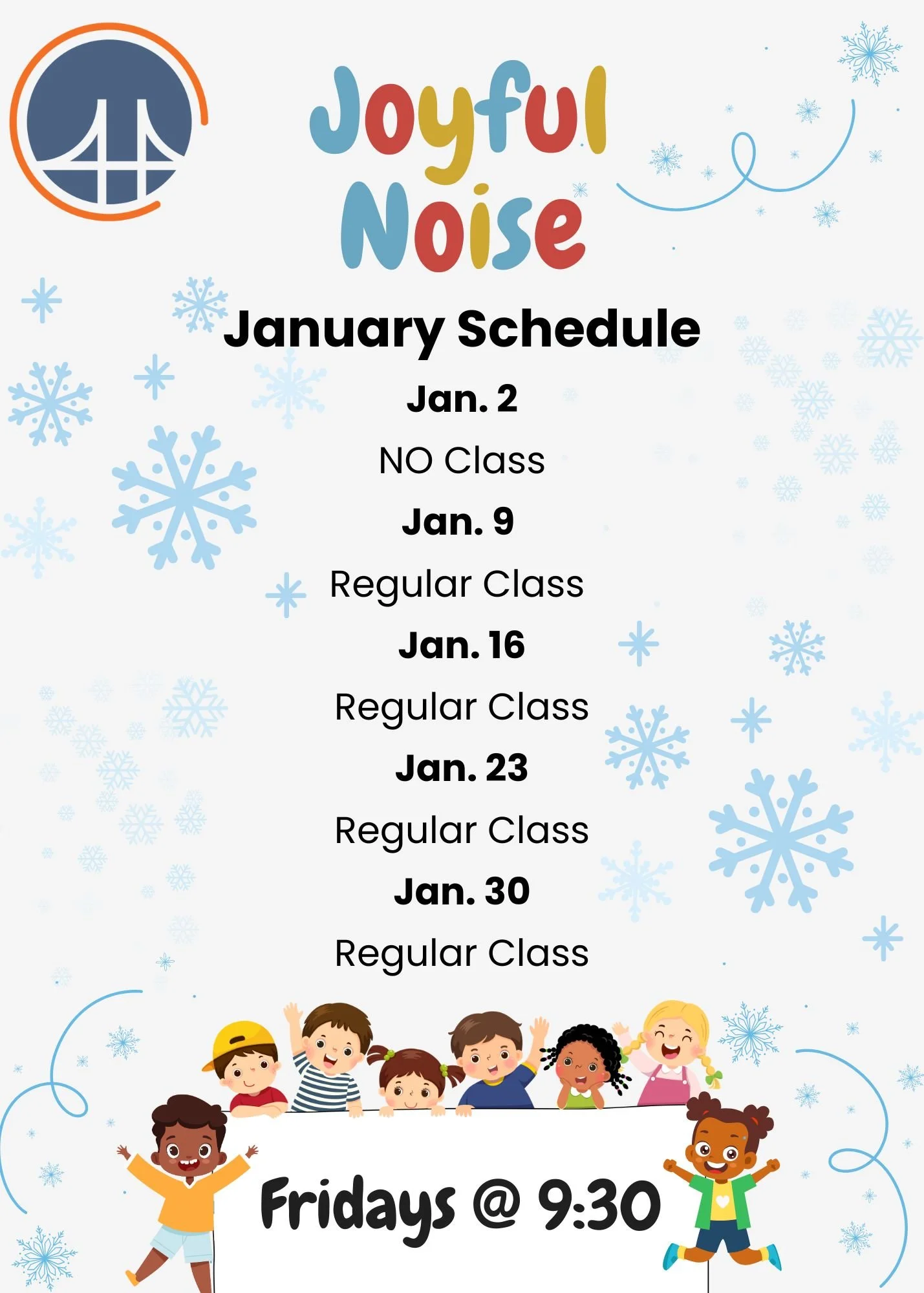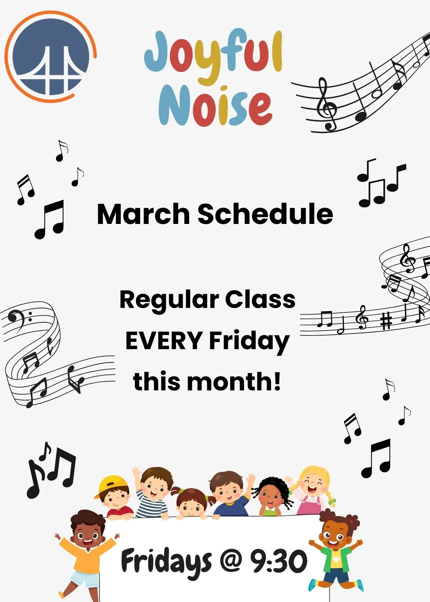 Joyful Noise is a weekly music and movement play group that is taught "parent and me" style. Little ones will play bells, maracas, drums, and other instruments as we learn the basics of beat and pitch to fun worship songs. We'll sing, dance, and work out our wiggles in exciting ways. Help us encourage all of God’s children to make a "joyful noise" to the Lord!